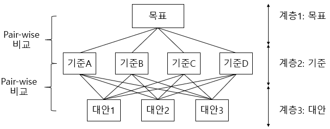 - 계층 구조 설정: 의사결정 문제를 기준, 하위 기준, 대안으로 나누어 계층 구조를 형성합니다. 이 계층 구조는 일반적으로 최상위에 전체 목표를 두고, 중간에는 기준과 하위 기준, 최하위에는 의사결정 대안을 배치합니다.