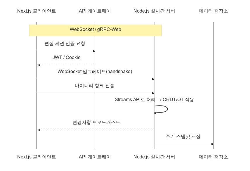 이와 같이 아키텍처와 프로토콜 측면에서, Next.js + Node.js 기반의 실시간 편집 서비스는 WebSocket을 통해 텍스트/이미지 등 혼합 데이터의 스트리밍 전송을 가능하게 하고, Node.js Streams 활용과 데이터 분할/동기화 전략으로 대용량 데이터도 끊김 없이 처리하는 구조를 갖추게 됩니다.